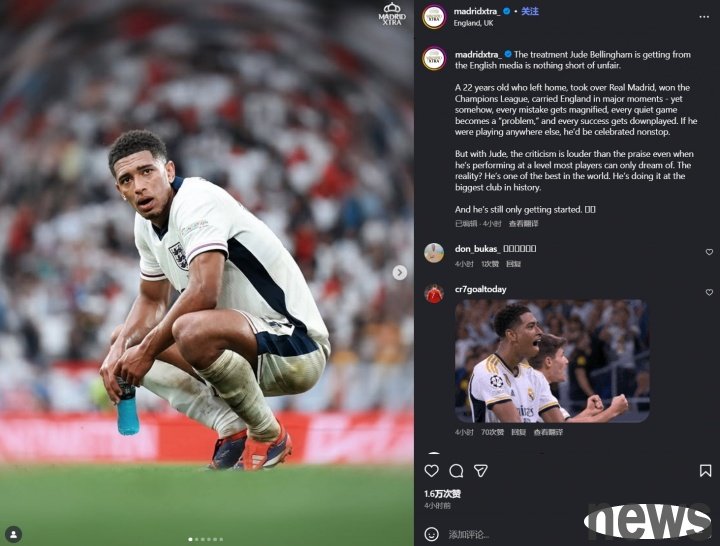 Previously, England defeated Albania 2-0. Bellingham was replaced in the 84th minute. After the game, the media heatedly discussed his performance and his dissatisfaction when he came off the field. Real Madrid-related blogger MadridXtra posted a comment on social media. The content is as follows.