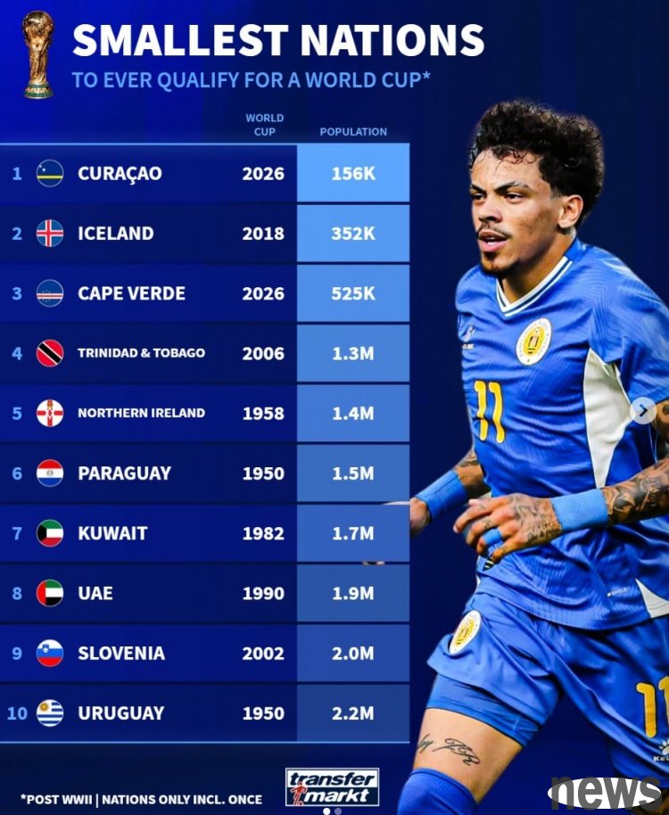 There are currently only a few play-off spots left to be determined in the World Cup preliminaries. Curacao, with 156,000 people, has become the country with the smallest population to qualify for the World Cup after World War II. "Transfer Market" also counted the top ten countries with the smallest population to qualify for the World Cup after World War II.