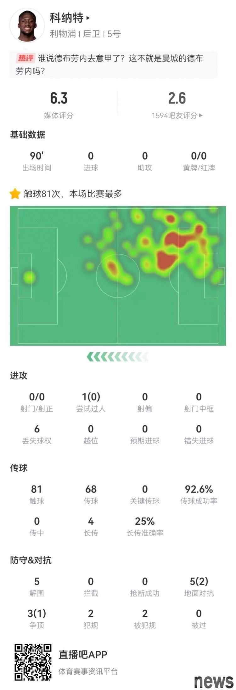 Liverpool defeated Manchester City 0-3 in this round of the Premier League. Konate's statistics for this game are as follows: