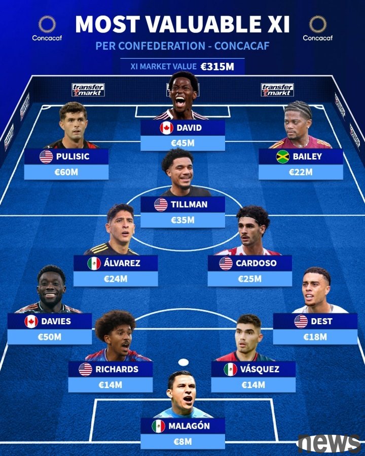 Dezhuan has taken stock of the most valuable lineup of CONCACAF players, with the total value of the entire lineup reaching 315 million euros. Among them, American winger Pulisic became the most valuable player with 60 million euros, and Canadian defender Alphonso Davis ranked second with 50 million euros.