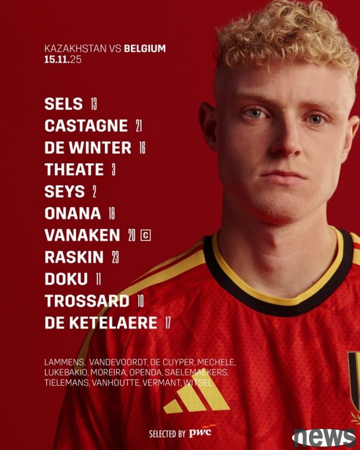 Belgian starting lineup: 13-Sells, 21-Castagne, 16-Dewente, 3-Tate, 2-Sess, 18-Amadou Onana, 20-Wakena, 23-Rashkin, 11-Doku, 10-Trossard, 17-De Ketrare